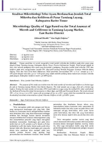 Akhmad Rizaldi and Engki Zelpina (2020) Kualitas mikrobiologi telur ayam berdasarkan jumlah total mikroba dan kolifrom di Pasar Tamiang Layang, Kabupaten Barito Timur. Journal of Livestock and Animal Health, 3 (2): 3. pp. 45-48. ISSN 2655-4828