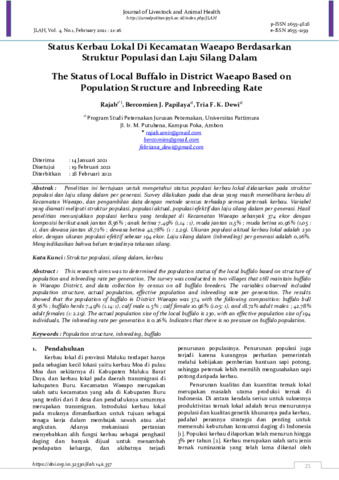 Penelitian ini bertujuan untuk mengetahui status populasi kerbau lokal didasarkan pada struktur populasi dan laju silang dalam per generasi. Survey dilakukan pada dua desa yang masih memelihara kerbau di Kecamatan Waeapo, dan pengambilan data dengan metode sensus terhadap semua peternak kerbau. Variabel yang diamati meliputi struktur populasi, populasi aktual, populasi efektif dan laju silang dalam per generasi. Hasil penelitian menunjukkan populasi kerbau yang terdapat di Kecamatan Waeapo sebanyak 374 ekor dengan komposisi berikut anak jantan 8,56% ; anak betina 7,49% (1,14 : 1), muda jantan 11,5% ; muda betina 10,96% (1,05 : 1), dan dewasa jantan 18,72% ; dewasa betina 42,78% (1 : 2,29). Ukuran populasi aktual kerbau lokal adalah 230ekor, dengan ukuran populasi efektif sebesar 194 ekor. Laju silang dalam (inbreeding) per generasi adalah 0,26%. Mengindikasikan bahwa belum terjadinya tekanan silang.