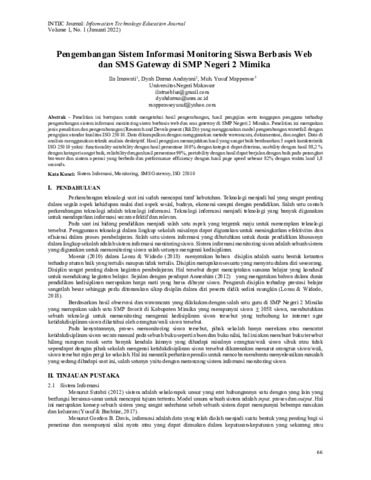 Ila, Irnawati and Dyah, Darma Andayani and Muh., Yusuf Mappeasse (2022) Pengembangan sistem informasi monitoring siswa berbasis web dan SMS gateway di SMP Negeri 2 Mimika. Information Technology Education Journal, 1 (1): 8. pp. 66-74. ISSN 2809-7971