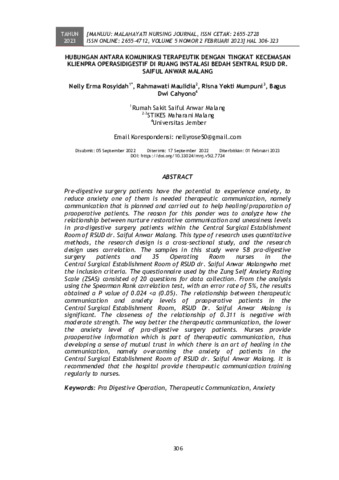 Nelly, Erma Rosyidah and Rahmawati, Maulidia and Risna, Yekti Mumpuni and Bagus, Dwi Cahyono (2023) Hubungan antara komunikasi terapeutik dengan tingkat kecemasan klienpra operasi digestif di ruang instalasi bedah sentral RSUD Dr. Saiful Anwar Malang. MANUJU: MALAHAYATI NURSING JOURNAL, 5 (2): 1. pp. 306-323. ISSN 2655-2728