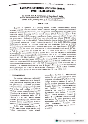 Lapisan E sporadis (E3) penting diteliti karena kemunculannya cukup berpengaruh pada komunikasi radio. Oleh karena itu berbagai teknik dilakukan untuk mengamati kemunculan lapisan Es, dari penggunaan radar High Frequency (HF) seperti ionosonda sampai teknologi terbaru seperti teknik Global Positioning System Radio Occultation (GPS-RO). Kekurangan pengukuran dengan ionosonda adalah hanya satu titik pengamatan. Sedangkan kelebihan yang diperoleh dari teknik GPS-RO adalah pengamatannya yang bersifat global. Pada makalah ini dibahas lapisan Es secara global yang diperoleh dari teknik GPS-RO dari satelit Low Earth Orbit (LEO) GPS/Meteorology (OPS/MET) dan satelit LEO CHAMP. Penelitian yang dilakukan Hocke et. al (2001) menunjukkan peta kemunculan Es terhadap ketinggian yang diperoleh dari GPS/MET. Pada bulan Juni-Juli 1995, peta kemunculan Es menunjukkan kuat di daerah 20°LU- 20°LS dan sangat kuat di daerah 30°-60°LU. Pada bulan Oktober 1995, peta kemunculan Es menunjukkan kuat di daerah 30°LU-30°LS. Sedangkan pada bulan Februari 1997, peta kemunculan Es menunjukkan kuat di O°-10°LS dan sangat kuat di daerah 40°-90°LS. Penelitian yang dilakukan Wu et. al (2005) menunjukkan peta kemunculan Espada ketinggian 105 kilometer yang diperoleh dari GPS/CHAMP. Pada bulan Juni-Agustus 2002, kemunculan Es sangat kuat di daerah belahan bumi utara tepatnya di lintang geomagnet 30° - 70°LU. Sementara pada bulan Desember 2002-Februari 2003, kemunculan Es sangat kuat di daerah belahan bumi selatan tepatnya di lintang geomagnet 20°-60°LS. Pada periode ini sebagian wilayah selatan Indonesia, yaitu di atas pulau Jawa dan NTT terlihat kemunculan Es yang cukup kuat.