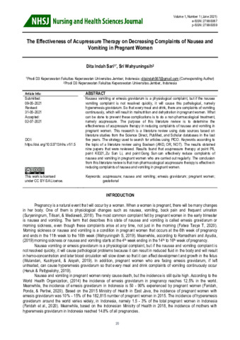 Dita Indah, Sari and Sri, Wahyuningsih (2021) The Effectiveness of acupressure therapy on decreasing complaints of nausea and vomiting in pregnant women. Nursing and Health Sciences Journal, 1 (1): 4. pp. 20-30. ISSN 2798-5059