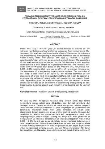 Irmawati and Rotua Lenawati Tindaon and Haswani and Haziyah (2023) Pengaruh tehnik marmet terhadap kelancaran asi pada ibu postpartum di Puskesmas Sei Berombang Kecamatan Panai Hilir. MANUJU: Malahayati Nursing Journal, 5 (2): 17. pp. 515-520. ISSN 2655-2728