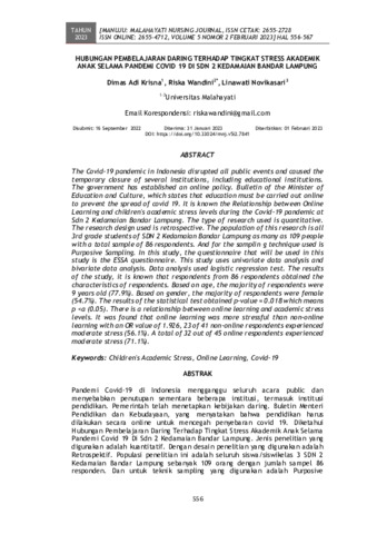 Dimas Adi Krisna and Riska Wandini and Linawati Novikasari (2023) Hubungan pembelajaran daring terhadap tingkat stress akademik anak selama pandemi covid 19 di SDN 2 Kedamaian Bandar Lampung. MANUJU: Malahayati Nursing Journal, 5 (2): 21. pp. 556-567. ISSN 2655-2728