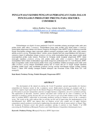 Adhisty Radhita, Vasya and Adinda, Salsabilla (2022) Pengawasan komisi pengawas persaingan usaha dalam pencegahan predatory pricing pada sektor e commerce. Lex Scripta: Journal of Legal Research, 1 (2): 1. pp. 1-13. ISSN 2809-2120
