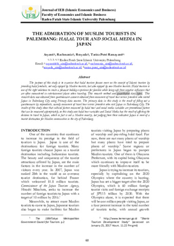 Aryanti and Rachmania and Rosyada and Tariza Putri Ramayanti (2022) The admiration of Muslim tourists in Palembang: halal tour and social media in Japan. Journal of Islamic Economics and Business, 1 (2): 6. pp. 60-68. ISSN 2829-8055