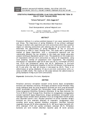 Yohana, Febriyanti and Nofa, Anggaraini (2023) Efektivitas pemberian nifedipin 10 mg pada kontraksi pre term di RSIA St Yusuf Tanjung Priok. MANUJU: MALAHAYATI NURSING JOURNAL, 5 (2): 24. pp. 589-600. ISSN 2655-2728