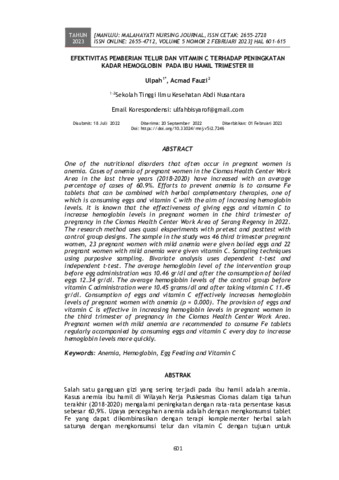 Ulpah and Acmad Fauzi (2023) Efektivitas pemberian telur dan vitamin c terhadap peningkatan kadar hemoglobin pada ibu hamil trimester III. MANUJU: Malahayati Nursing Journal, 5 (2): 25. pp. 601-615. ISSN 2655-2728