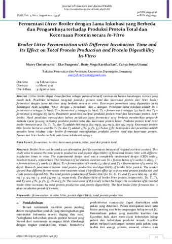 Marry, Christiyanto and Eko, Pangestu and Betty, Mega Kartika Sari and Cahya, Setya Utama (2021) Fermentasi litter broiler dengan lama inkubasi yang berbeda dan pengaruhnya terhadap produksi protein total dan kecernaan protein secara in-vitro. Journal of Livestock and Animal Health, 4 (2): 1. pp. 33-38. ISSN 2655-4828
