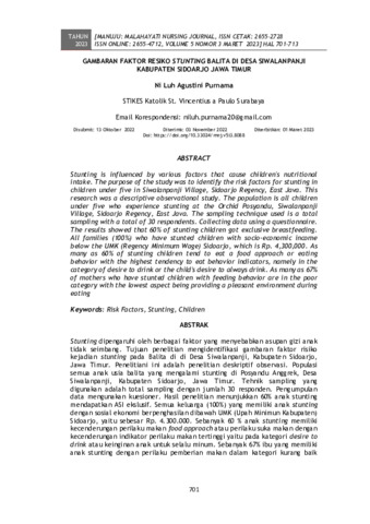 Ni Luh Agustini Purnama (2023) Gambaran faktor resiko stunting balita di Desa Siwalanpanji Kabupaten Sidoarjo Jawa Timur. MANUJU: MALAHAYATI NURSING JOURNAL, 5 (3): 7. pp. 701-713. ISSN 2655-2728