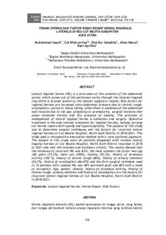 Muhammad Sayuti and Cut Khairunnisa and Elsa Nur Salsabila and Jihan Haura and Rani Aprilita (2023) Teknik operasi dan faktor risiko residif hernia inguinalis lateralis di RSU Cut Meutia Kabupaten Aceh Utara. MANUJU: MALAHAYATI NURSING JOURNAL, 5 (3): 9. pp. 728-738. ISSN 2655-2728