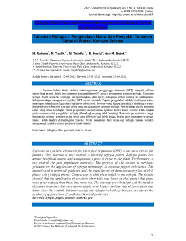 Rahayu, Mallarangeng and Muhammad, Taufik Muhayang and M, Tufaila H and Rachmawati, Hasid (2022) Tanaman refugia: Pengelolaan hama dan penyakit tanaman cabai di Wolasi Konawe Selatan. Jurnal Karya Pengabdian, 4 (2): 2. pp. 74-81. ISSN 2655-8068