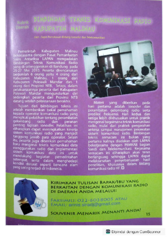 Septi Perwitasari (2010) Rubrik daerah: bimbingan teknis komunikasi radio Kabupaten Malinau. Buletin Komunikasi Radio: Cuaca Antariksa dan Telekomunikasi, 2 (4): 9. p. 15. ISSN 2086-1958
