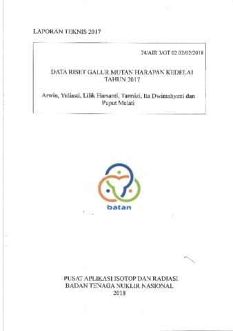 Arwin, Arwin and Yuliasti, Yuliasti and Harsanti, Lilik and Tarmizi, Tarmizi and Dwimahyani, Ita and Melati, Puput (2017) Laporan Teknis 2017: DATA RISET GALUR MUTAN HARAPAN KEDELAI. Technical Report. PAIR BATAN.