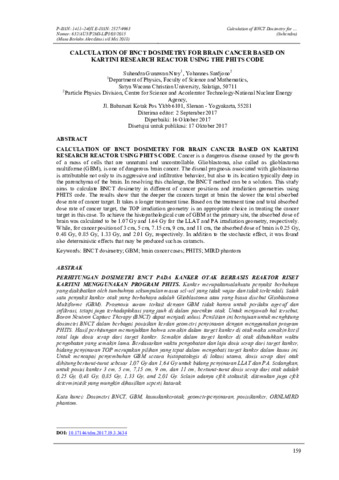 Gunawan, Suhendra and Sardjono, Yohanes (2017) CALCULATION OF BNCT DOSIMETRY FOR BRAIN CANCER BASED ON KARTINI RESEARCH REACTOR USING THE PHITS CODE. Tri Dasa Mega, 19 (3). pp. 159-168. ISSN P-ISSN: 1411–240X E-ISSN: 2527-9963