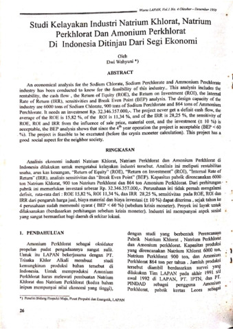 Analisis ekonomi industri Natrium Khlorat, Natrium Perkhlorat dan Amonium Perkhlorat di Indonesia dilakukan untuk mengetahui kelayakan industri tersebut. Analisis ini meliputi rentabilitas usaha, arus kas keuangan, "Return of Equity" (ROE), "Return on Investment" (ROI), "Internal Rate of Return" (IRR), analisis sensitivitas dan "Break Even Point" (BEP). Kapasitas pabrik direncanakan 6000 ton Natrium Khlorat, 900 ton Natrium Perkhlorat dan 864 ton Amonium Perkhlorat. Dari perhitungan pabrik ini memerlukan investasi sebesar Rp. 32.346.357.000,-. Perusahaan ini tidak pernah mengalami defisit, rata-rata dari : ROE 15,82 %, ROI 11,34 %, dan IRR 28,25 %, sensitivitas pada ROE, ROI dan IRR dari pengaruh harga jual, biaya material dan biaya investasi (± 10 %) dapat diterima, sejak tahun ke 4 perusahaan sudah memenuhi syarat (BEP < 60 %) (sebelum krisis moneter). Proyek ini layak untuk dilaksanakan (berdasarkan perhitungan sebelum krisis moneter). Industri ini mempunyai aspek sosial. yang sangat bermanfaat bagi daerah di sekitar lokasi.
