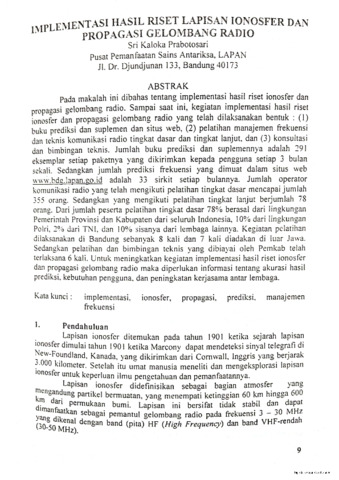 Sri Kaloka Prabotosari (2008) Implementasi hasil riset lapisan ionosfer dan propagasi gelombang radio. In: Prosiding Workshop Komunikasi Radio: Peran Komunikasi Radio dalam Upaya Merajut Wilayah Nusantara, 20 November 2007, Bandung.