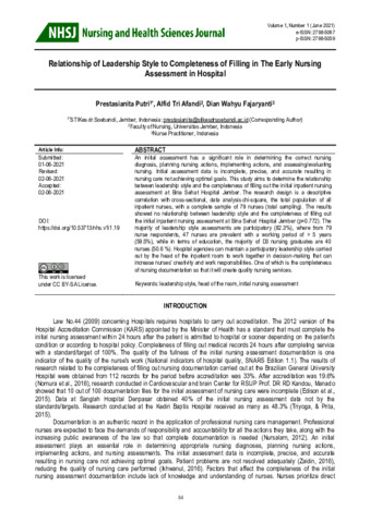 Prestasianita, Putri and Alfid Tri, Afandi and Dian Wahyu, Fajaryanti (2021) Relationship of Leadership Style to Completeness of Filling in The Early Nursing Assessment in Hospital. Nursing and Health Sciences Journal, 1 (1): 11. pp. 64-68. ISSN 2798-5059