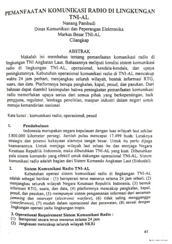 Makalah ini membahas tentang pemanfaatan komunikasi radio di lingkungan TNI Angkatan Laut. Bahasannya meliputi kondisi sistem komunikasi radio di lingkungan TNI-AL, operasional, kendala-kendala, dan upaya peningkatannya. Kebutuhan operasional komunikasi radio di TNI-AL mencakup waktu 24 jam perhari, menjangkau seluruh wilayah, bentuk informasi RTG, suara, dan data. Platformnya berupa pangkalan, kapal, pesud, dan pasukan. Dari bahasan dapat diambil kesimpulan bahwa peningkatan pemanfaatan komunikasi radio memerlukan upaya serius dari semua pihak yang berkepentingan, baik pengguna, regulator, lembaga penelitian, maupun industri dalam negeri untuk menuju kemandirian nasional.