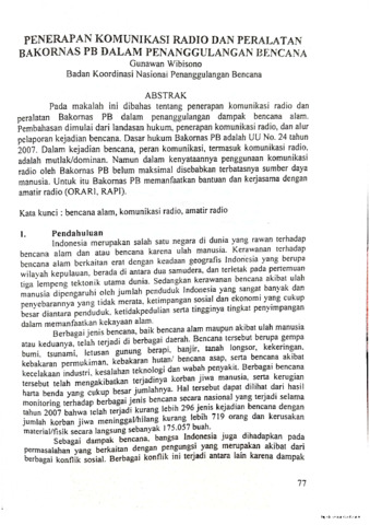 Pada makalah ini dibahas tentang penerapan komunikasi radio dan peralatan Bakornas PB dalam penanggulangan dampak bencana alam. Pembahasan dimulai dari landasan hukum, penerapan komunikasi radio, dan alur pelaporan kejadian bencana. Dasar hukum Bakornas PB adalah UU No. 24 tahun 2007. Dalam kejadian bencana, peran komunikasi, termasuk komunikasi radio, adalah mutlak/dominan. Namun dalam kenyataannya penggunaan komunikasi radio oleh Bakornas PB belum maksimal disebabkan terbatasnya sumber daya manusia. Untuk itu Bakornas PB memanfaatkan bantuan dan kerjasama dengan amatir radio (ORARI, RAPI).