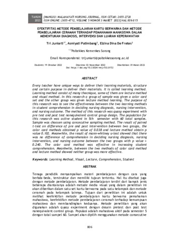 Tri Juniarti and Asmiyati Patimbang and Elzina Dina De Fretes (2023) Efektifitas metode pembelajaran kartu berwarna dan metode pembelajaran ceramah terhadap pemahaman mahasiswa dalam menentukan diagnosis, intervensi dan luaran keperawatan. MANUJU: Malahayati Nursing Journal, 5 (3): 15. pp. 806-815. ISSN 2655-2728