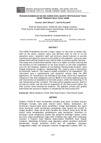 Pandemi COVID-19 telah memberikan dampak yang besar terhadap tatanan kehidupan manusia, baik pada tatanan sosial, budaya, kenegaraan, dan kerohanian maupun pada sektor pendidikan. tenaga kependidikan dan dosen harus berinovasi untuk memberikan perkuliahan yang inovatif dan efektif di tengah pandemi. Dosen harus selalu berpikir dan mencari solusi serta ide-ide kreatif untuk menghasilkan pembelajaran yang berkualitas. Penelitian ini bertujuan untuk mengetahui apakah ada pengaruh bimbingan belajar online dan lama waktu penyelesaian tugas akhir terhadap nilai tugas akhir mahasiswa semester 6 Program Studi Diploma Keperawatan Politeknik Insan Husada Surakarta. Metodologi Penelitian yang digunakan adalah penelitian deskriptif korelasional. Sampel penelitian terdiri dari 49 responden. Instrumen menggunakan angket dan pengujian statistik menggunakan aplikasi SPSS. 25. Berdasarkan temuan penelitian ini, terdapat pengaruh yang signifikan terhadap nilai tugas akhir sebesar 68,8% pada proses bimbingan online dan durasi penyelesaian tugas akhir, sedangkan sisanya 31,1% dipengaruhi oleh variabel lain. Proses bimbingan tugas akhir yang dilakukan secara online, dan waktu penyelesaian tugas akhir mempengaruhi nilai tugas akhir yang diperoleh mahasiswa. Proses bimbingan masih sangat menentukan keberhasilan mahasiswa dalam menyelesaikan tugas akhir/KTI.