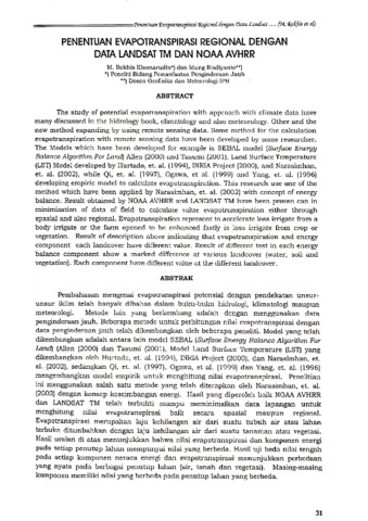 Persbahasan mergenai evapotranspirasi potensial dengan pendekatan unsur-unsur iklim telah banyak dibahas dalam buku-buku hidrologi, idimatologi maupan meteorologi. Metode lain yang berkembang adalah dengan mengrunakan data penginderaan jauh. Beberapa cetode untuk pechitungan nilai evapotranspirasi dengan data penginderaan jauh telals dikembangkan oleh beberapa peneliti. Model yans telah dikembangian adalah antara lain model SEBAL (Suc/ace Energy Balance Algorithin For Land (Allen (2000} dan Tasumi (20011, Model Land Surface Temperature (187) yang diberabangkan dieh Hurtado, et. al. (1994), INRIA Project (3000l, dan Narasimhan, et. sI. (2002), sedangkan Qi, et. al. (1997), Ogawa, et al. (1999) dan Yang, et. al. (1996) mengebandan model empirik untul menghitung nilai evapotranspirasi. Penelitian in menggunakan salah satu metode yang telah diterapkan elek Narasinshan, et. al. (2002) dengan konsep kescimbangan energi. Hasil yang diperaleh baik NOAA AVHRR dan LANDSAT TM telsh perbulti mampa meminimalkan data lapagan untuk mengtune nilial evapotranspirasi bail secara spasial maupan regional. Evapotranspirasi merupakan laja kehilangan air dari suatu cabuh air atas lahan terbuka ditambahican dengan laju kehilangan air dari suatu canaman atau vegstasi. "Hasil uraian di atas menunjuian bahwa nilai evapotranspirasi dan komponen cnergi pads setiap penutup lahan merspunyai niai yang berbeda. Hasil uji beda nilai tengah pada setiap komponen sersca energi dan evapotranspirasi menunjulan perbedaan yang nyata pada berbagai persutup lahan (air, tanah dan vegetasi). Masing-masing kamponen memitild nilai yang berbeda pada penutup lahan yang berbeda.
