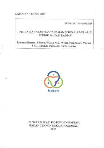 Human, Soeranto and Sihono, Sihono and Indriatama, Wijaya M. and Puspitasari, Winda and M., Marina Y. and Carkum, Carkum and Parno, Parno and Suseno, Tardi (2017) Laporan Teknis 2017: PERBAIKAN VARIETAS TANAMAN SEREALIA MELALUI TEKNIK MUTASI RADIASI. Technical Report. PAIR BATAN.