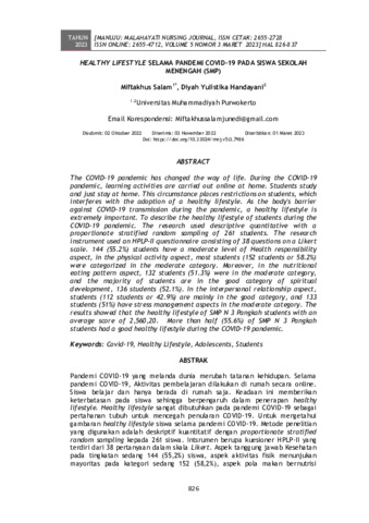 Miftakhus Salam and Diyah Yulistika Handayani (2023) Healthy lifestyle selama pandemi covid-19 pada siswa sekolah menengah (SMP). MANUJU: MALAHAYATI NURSING JOURNAL, 5 (3): 17. pp. 826-837. ISSN 2655-2728