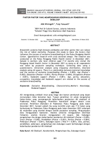 Atik Winingsih and Tuty Yanuarti (2023) Faktor-faktor yang mempengaruhi keberhasilan pemberian asi eksklusif. MANUJU: Malahayati Nursing Journal, 5 (3): 22. pp. 889-902. ISSN 2655-2728