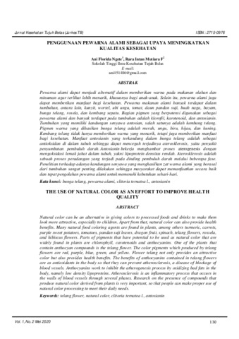 Ani, Florida Ngete and Rara, Intan Mutiara F (2020) Penggunaan pewarna alami sebagai upaya meningkatkan kualitas kesehatan. Jurnal Kesehatan Tujuh Belas (Jurkes TB), 1 (2): 7. pp. 130-135. ISSN 2715-0976