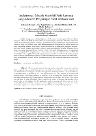 Auliya’ur, Rohman and Riky, Yoga Perkasa and Athia, Syarif Hidaytullah and M. Ghofar, Rohman (2022) Implementasi metode waterfall pada rancang bangun sistem pengarsipan surat berbasis web. Generation Journal, 6 (2): 7. pp. 134-143. ISSN 2580-4952