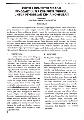 Permodelan kimia komputasi adalah ilmu kimia yang menggunakan hasil matematis kimia teori yang diterjemahkan ke dalam program komputer untuk menghitung sifat-sifat molekul dan perubahannya. Dalam perhitungan sifat-sifat molekul dan perubahannya diperlukan teoci mekanika kuantum dan komputer dengan kinerja yang tinggi seperti super komputer untuk menvelesaikan persamaan mekanila kuantum tersebut. Super komputer tunggal mulai dikenal luas pada tahun 1960-an hingga akhir tahun 1990-an. Setelah tahun 1990-an, banyak bermunculan cluster komputer yang mulai menggantikan super komputer tunggal. Cluster kamputer adalah kumpulan dari beberapa komputer tunggal dengan kinerja rendah menjadi satu kesatuan dengan kinerja yang tinggi, dan Cluster komputer juga biasa disebut sebagal super komputer. Kelebihan dari cluster komputer dibandingkan dengan super komputer tunggal adalah : 1) Tidak diperiukan sistem pendingin khusus. 2) mudah untuk, ditingkatkan kinerjanya (dengan penambahan jumlah komputer tungsal).