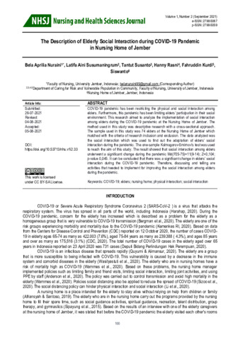 Bela Aprilia, Nuraini and Latifa Aini, Susumaningrum and Tantut, Susanto and Hanny, Rasni and Fahruddin, Kurdi and Siswanto, Siswanto (2021) The Description of Elderly Social Interaction during COVID-19 Pandemic in Nursing Home of Jember. Nursing and Health Sciences Journal, 1 (2): 3. pp. 100-106. ISSN 2798-5059