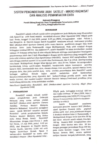 RazakSAT adalah sebuah satelit-mikro penginderaan jauh Malaysia yang diluncurkan oleh SpaceX ke orbit bumi rendah mendekati ekuator (Near Equatorial Orbit -NEq0) pada hari Senin, tanggal 13 Juli 2009, pulal 8:35 pm (PDT), menggunakan roket Falcon 1, dari Kwajalein di Omelek Island. Satelit RazakSAT membawa sebuah instrument pencitra MAC (Medium-sized Aperture Camera) yaitu suatu kamera pushbroom dengan lima buah detektor linier (satu Pankromatik, empat Multispektral). Pada orbit nominal dengan ketinggian nominal 685 km dan inklinasi 9° 1, satelit RazakSAT ini akan memberikan jumlah optimal 14 lintasan setiap hari di atas wilayah Malaysia schingga meningkatican kesempatan pencitraannya. lebih dari 3 kali dibandingkan dengan satelit sejenisnya yang mengorbit pada jenis orbit sinkron matahari (Sur-Synchronous Orbit-SSO). Kamera MAC menghasilkan data citra dengan resolusi spasial 2.5 m untuk citra Pankromatik, dan 5 m untuk masing-masing citra kanal Multispektral, dengan lebar liputan satu citra 30 km. Tulisan ini menguraikan karakteristik teknis satelit-mikro RazakSAT, karakteristik teknis instrument pencitra Kamera MAC, karakteristik data citra, elemen-elemen ruas antariksa, operasi stasiun bumi, program data, dan jenis produk data, serta analisis pemanfaatan data RazakSAT untuk berbagai aplikasi. Metode kajian adalah melakukan studi berdasarkan literatur/informasi/data yang diperoleh dari badan/lembaga pemilik satelit serta dari media internet, dan sumber-sumber referensi literatur lainya/hasil-hasil penelitian yang berkembang dewasa ini, serta melakukan analisis.