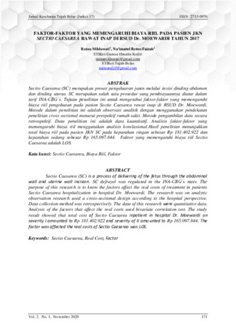 Ratna, Mildawati and Na’imatul, Retno Faizah (2020) Faktor-faktor yang memengaruhi biaya riil pada pasien JKN sectio caesarea rawat inap di RSUD Dr. Moewardi tahun 2017. Jurnal Kesehatan Tujuh Belas (Jurkes TB), 2 (1): 6. pp. 171-181. ISSN 2715-0976