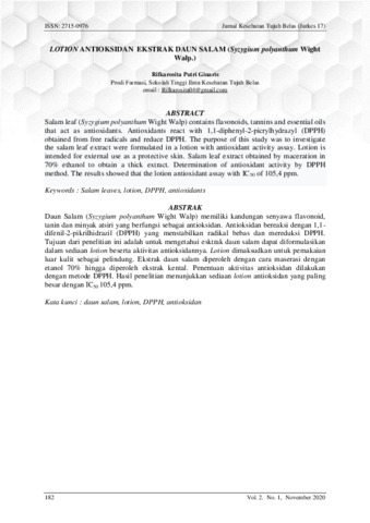 Rifkarosita, Putri Ginaris (2020) Lotion antioksidan ekstrak daun salam (Syzygium polyanthum Wight Walp.). Jurnal Kesehatan Tujuh Belas (Jurkes TB), 2 (1): 7. pp. 182-188. ISSN 2715-0976