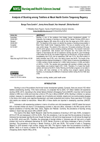 Bunga Tiara, Carolin and Jenny Anna, Siauta and Nur, Amamah and Shinta, Novelia (2021) Analysis of Stunting among Toddlers at Mauk Health Centre Tangerang Regency. Nursing and Health Sciences Journal, 1 (2): 6. pp. 118-124. ISSN 2798-5059