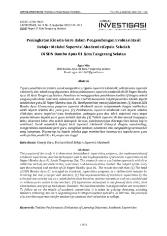 Agus, Niin (2022) Peningkatan kinerja guru dalam pengembangan evaluasi hasil belajar melalui supervisi akademis Kepala Sekolah di SDN Bambu Apus 01 kota Tangerang Selatan. Jurnal Investigasi : Penelitian dan Pengembangan Pendidikan, 3 (2): 2. pp. 153-162. ISSN 2720-9334