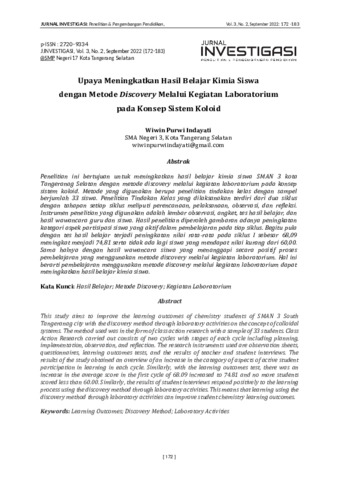 Wiwin, Purwi Indayati (2022) Upaya meningkatkan hasil belajar kimia siswa dengan metode discovery melalui kegiatan laboratorium pada konsep sistem koloid. Jurnal Investigasi : Penelitian dan Pengembangan Pendidikan, 3 (2): 4. pp. 172-183. ISSN 2720-9334