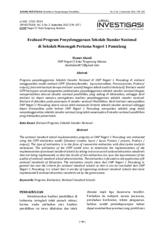 Program penyelenggaraan Sekolah Standar Nasional di SMP Negeri 1 Pamulang di evaluasi menggunakan model evaluasi CIPP (Context/konteks, Input/masukkan, Process/proses, Product/ output). Jenis evaluasinya berupa evaluasi sumatif dengan teknik analisis deskriptif. Evaluasi model CIPP bertujuan untuk mengetahui pelaksanaan penyelenggaraan sekolah standar nasional dengan memperhatikan seluruh standar nasional pendidikan yang sedang di laksanakan, sehingga hasil evaluasi ini dapat memacu peningkatan kualitas penyelenggaraan sekolah standar nasional.