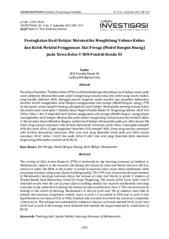 Nudin, Nudin (2022) Peningkatan hasil belajar matematika menghitung volume kubus dan balok melalui penggunaan alat peraga (model bangun ruang) pada siswa kelas V SDN Pondok Benda 01. Jurnal Investigasi : Penelitian dan Pengembangan Pendidikan, 3 (2): 7. pp. 208-219. ISSN 2720-9334