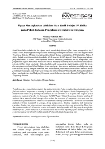 Penelitian tindakan kelas ini bertujuan untuk mendeskripsikan aktifitas siswa, mengetahui hasil belajar siswa, dan mengetahui respon siswa terhadap pembelajaran di kelas VII-8 SMP Negeri 9 Kota Tangerang Selatan. Metode yang digunakan Metode Group Investigation. PTK dilakukan dalam 3 siklus. Subjek penelitian adalah siswa kelas VII-8 semester 1 SMP Negeri 9 Kota Tangerang Selatan yang berjumlah 35 siswa. Data diperoleh melalui observasi, pemberian tes uji kompetensi, dan penyebaran angket. Kemudian dianalisilis secara deskriptif kualitatif. Hasil penelitian menunjukan bahwa aktifitas siswa meningkat dalam berkelompok, mengerjakan tugas-tugas, berfikir bersama, dan menjawab soal-soal. Hasil belajar siswa meningkat dan respon terhadap pembelajaran yang dilaksanakan positif. Dengan demikian dari pelaksanaan penelitian tindakan kelas melalui model pembelajaran dengan metode group investigation siklus I , siklus II dan siklus III, disimpulkan bahwa dapat meningkatkan hasil belajar fisika pada pokok bahasan Asam dan Basa di SMP Negeri 9 Kota Tangerang Selatan