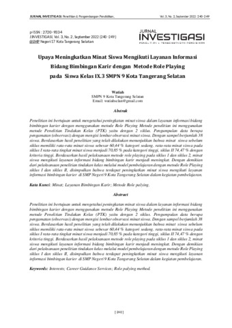 Watiah, Watiah (2022) Upaya meningkatkan minat siswa mengikuti layanan informasi bidang bimbingan karir dengan metode role playing pada siswa kelas IX.3 SMPN 9 Kota Tangerang Selatan. Jurnal Investigasi : Penelitian dan Pengembangan Pendidikan, 3 (2): 10. pp. 240-249. ISSN 2720-9334