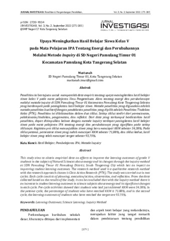 Penelitian ini bertujuan untuk memperoleh data empiris tentang upaya meningkatkan hasil belajar siswa kelas V pada mata pelajaran Ilmu Pengetahuan Alam tentang energi dan perubahannya melalui metode inquiry di SDN Pamulang Timur 01 Kecamatan Pamulang Kota Tangerang Selatan yang berdampak pada peningkatan hasil belajar siswa. Metode penelitian yang digunakan adalah metode penelitian kualitatif dengan pendekatan penelitian yang dipilih adalah Penelitian Tindakan Kelas (PTK). Penelitian ini dilaksanakan dalam dua siklus. Setiap siklus terdiri dari perencanaan, pelaksanaan/tindakan, pengamatan, dan refleksi. Dari data yang terkumpul berdasarkan hasil penelitian, dapat disimpulkan bahwa dengan metode inquiry terdapat peningkatan hasil belajar siswa pada mata pelajaran IPA tentang energi dan perubahannya yang signifikan pada setiap siklusnya. Kegiatan pra siklus menunjukkan siswa yang baru mencapai KKM sebesar 34,38%. Pada siklus petama, persentase siswa yang sudah mencapai KKM sebesar 71,88%, dan siklus kedua, hasil belajar siswa yang telah mencapai target sebesar 93,75%.