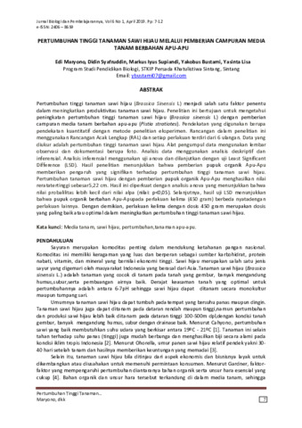 Edi, Maryono and Didin, Syafruddin and Markus, Iyus Supiandi and Yakobus, Bustami and Yasinta, Lisa (2019) Pertumbuhan tinggi tanaman sawi hijau melalui pemberian campuran media tanam berbahan apu-apu. Jurnal Biologi dan Pembelajarannya (JB&P), 6 (1): 2. pp. 7-12. ISSN 2406-8659