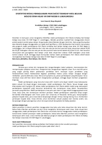 Ivoni, Susanti and Nopa, Nopianti (2019) Efektifitas model pembelajaran pair checks terhadap hasil belajar biologi siswa kelas VIII SMP Negeri 6 Lubuklinggau. Jurnal Biologi dan Pembelajarannya (JB&P), 6 (2): 2. pp. 4-6. ISSN 2406-8659