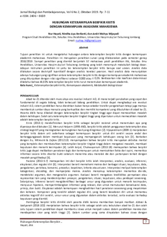 Nur, Hayati and Nindha, Ayu Berlianti and Andri, Wahyu Wijayadi (2019) Hubungan keterampilan berpikir kritis dengan kemampuan akademik mahasiswa. Jurnal Biologi dan Pembelajarannya (JB&P), 6 (2): 3. pp. 7-11. ISSN 2406-8659