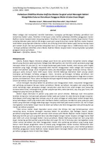 Maroloan, Aruan and Muhammad, Rizky Khaerullah and Stiya, Prihatin (2020) Perbedaan efektifitas masker buff dan masker surgical untuk mencegah bakteri menginfeksi saluran pernafasan pengguna motor di Jalan Daan Mogot. Jurnal Biologi dan Pembelajarannya (JB&P), 7 (1): 4. pp. 15-18. ISSN 2406-8659