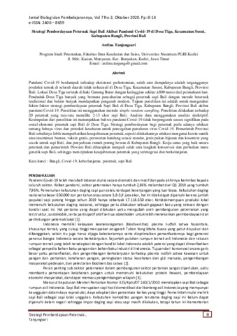 Ardina, Tanjungsari (2020) Strategi pemberdayaan peternak sapi bali akibat pandemi Covid-19 di Desa Tiga, Kecamatan Susut, Kabupaten Bangli, Provinsi Bali. Jurnal Biologi dan Pembelajarannya (JB&P), 7 (2): 2. pp. 8-14. ISSN 2406-8659